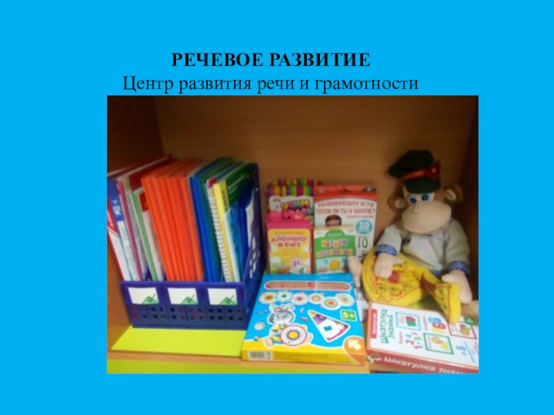 Пособия: большая книга заданий и упражнений для подготовки к школе (О.В. Узорова), «Грамматика в картинках», «Развитие речи детей 6-7 лет», «Артикуляционная гимнастика по темам недели», «Игры на обогащение и активизации речи дошкольников синонимами и антонимами», «Доскажи словечко». Картотека «Игры для развития речи детей», картотека упражнений с пальчиками, «ситуативные игры и инсценировки»