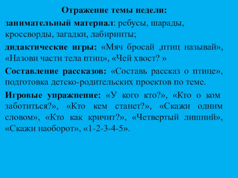 бросай ,птиц называй», «Назови части тела птиц», «Чей хвост? »