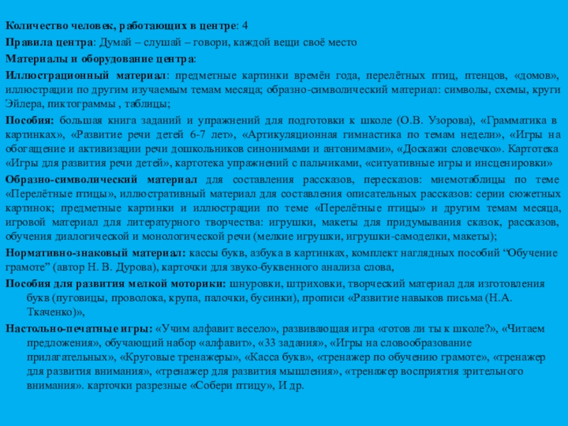 Образно-символический материал для составления рассказов, пересказов: мнемотаблицы по теме «Перелётные птицы», иллюстративный материал для составления описательных рассказов: серии сюжетных картинок; предметные картинки и иллюстрации по теме «Перелётные птицы» и другим темам месяца, игровой материал для литературного творчества: игрушки, макеты для придумывания сказок, рассказов, обучения диалогической и монологической речи (мелкие игрушки, игрушки-самоделки, макеты);