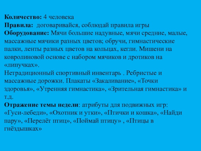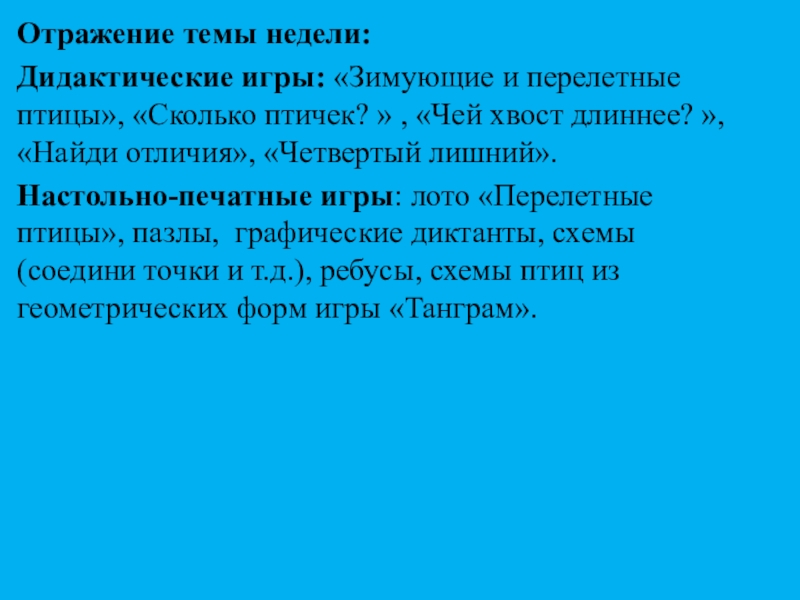 Отражение темы недели: атрибуты для подвижных игр: «Гуси-лебеди», «Охотник и утки», «Птички и кошка», «Найди пару», «Перелёт птиц», «Поймай птицу» , «Птицы в гнёздышках»
