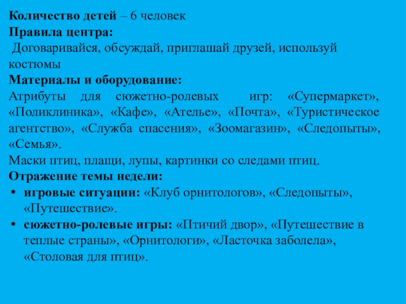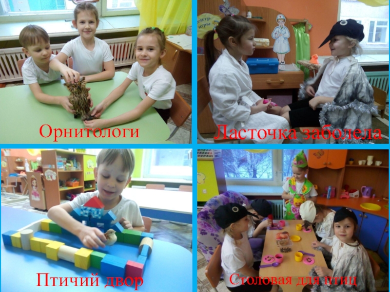 сюжетно-ролевые игры: «Птичий двор», «Путешествие в теплые страны», «Орнитологи», «Ласточка заболела», «Столовая для птиц».