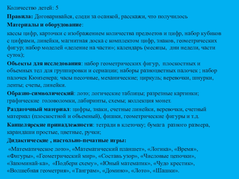 Объекты для исследования: набор геометрических фигур, плоскостных и объемных тел для группировки и сериации; наборы разноцветных палочек ; набор палочек Кюизенера; часы песочные, механические; циркуль; веревочки, шнурки, ленты; счеты, линейки.