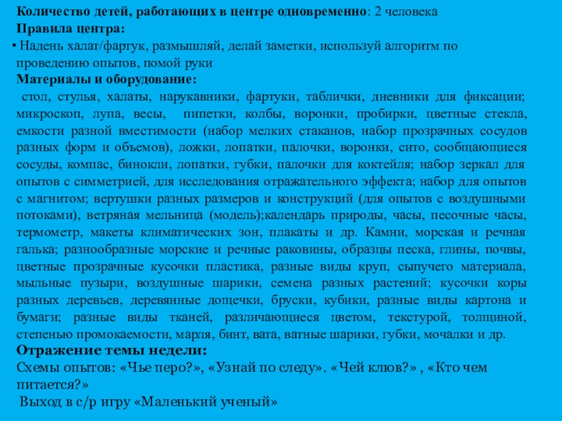 стол, стулья, халаты, нарукавники, фартуки, таблички, дневники для фиксации; микроскоп, лупа, весы, пипетки, колбы, воронки, пробирки, цветные стекла, емкости разной вместимости (набор мелких стаканов, набор прозрачных сосудов разных форм и объемов), ложки, лопатки, палочки, воронки, сито, сообщающиеся сосуды, компас, бинокли, лопатки, губки, палочки для коктейля; набор зеркал для опытов с симметрией, для исследования отражательного эффекта; набор для опытов с магнитом; вертушки разных размеров и конструкций (для опытов с воздушными потоками), ветряная мельница (модель);календарь природы, часы, песочные часы, термометр, макеты климатических зон, плакаты и др. Камни, морская и речная галька; разнообразные морские и речные раковины, образцы песка, глины, почвы, цветные прозрачные кусочки пластика, разные виды круп, сыпучего материала, мыльные пузыри, воздушные шарики, семена разных растений; кусочки коры разных деревьев, деревянные дощечки, бруски, кубики, разные виды картона и бумаги; разные виды тканей, различающиеся цветом, текстурой, толщиной, степенью промокаемости, марля, бинт, вата, ватные шарики, губки, мочалки и др.