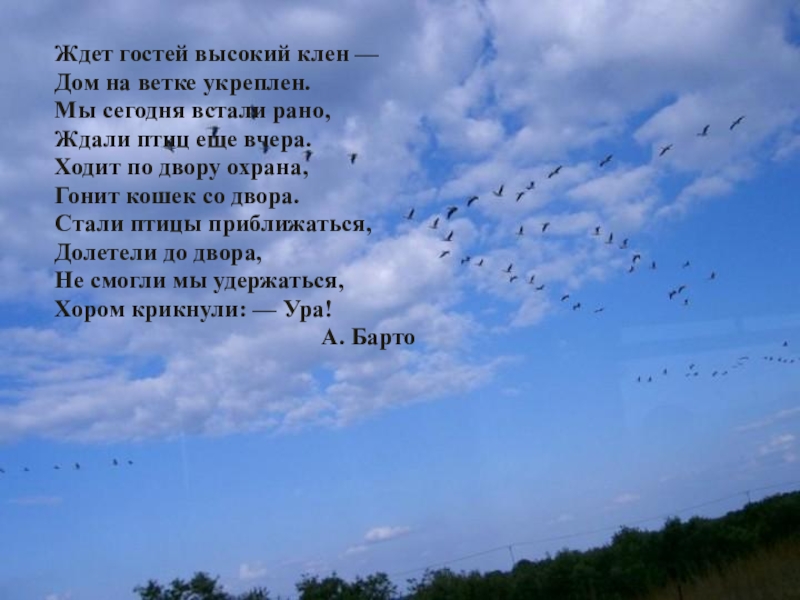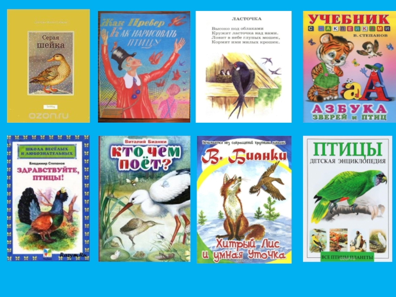 Стихи: Превер Ж. «Как нарисовать птицу?», Демыкина Г. «Птенцы научились летать», И.Белоусов «Весенняя гостья», В.Степанов «Птицы»