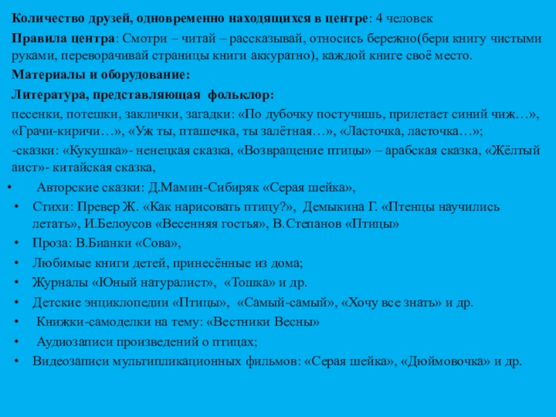 песенки, потешки, заклички, загадки: «По дубочку постучишь, прилетает синий чиж…», «Грачи-киричи…», «Уж ты, пташечка, ты залётная…», «Ласточка, ласточка…»;