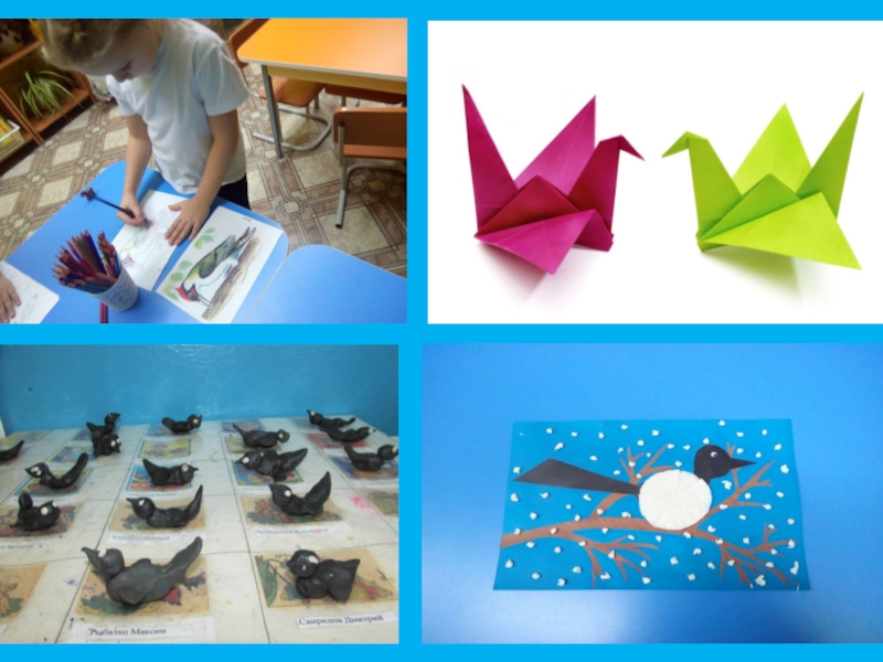 изготовление оригами «Грач», «Утка», « Лебедь», « Ласточка» для оформления верхнего пространства;