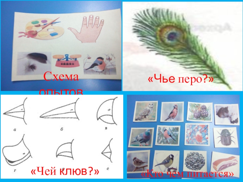 Схемы опытов: «Чье перо?», «Узнай по следу». «Чей клюв?» , «Кто чем питается?»