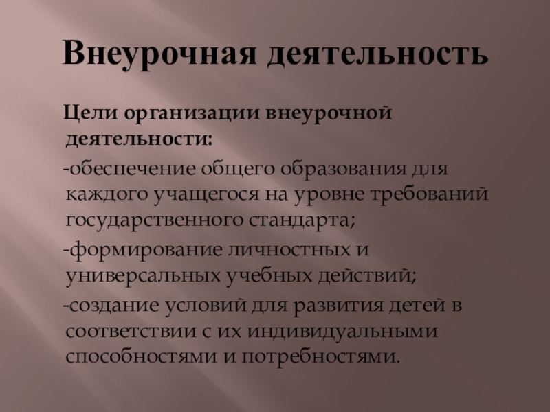 Внеурочная деятельность  Цели организации внеурочной деятельности:   -обеспечение общего образования для каждого учащегося на уровне