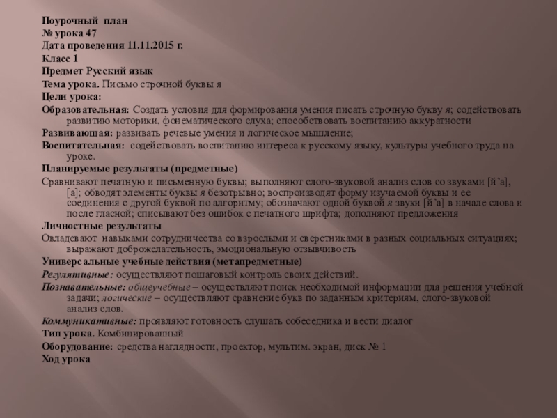 Поурочный план № урока 47Дата проведения 11.11.2015 г.    Класс 1  Предмет Русский языкТема