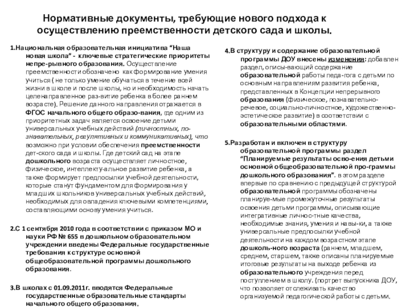 Слайд 17Нормативные документы, требующие нового подхода к осуществлению преемственности детского сада и