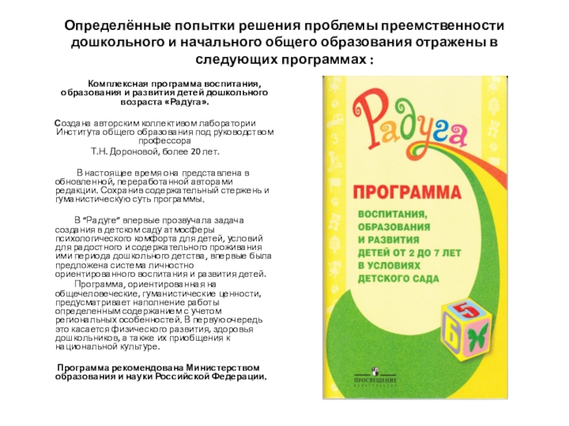Слайд 12Определённые попытки решения проблемы преемственности дошкольного и начального общего образования отражены