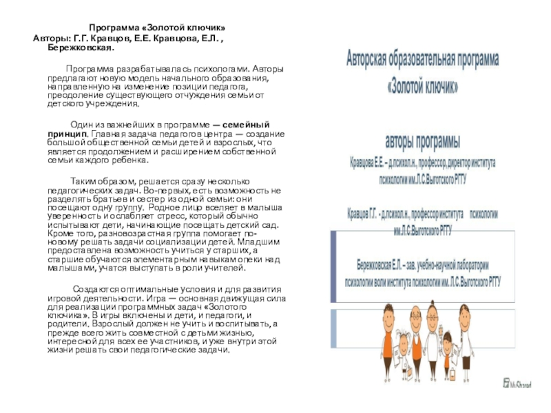 Программа разрабатывалась психологами. Авторы предлагают новую модель начального образования, направленную на изменение позиции педагога, преодоление существующего отчуждения семьи от детского учреждения.