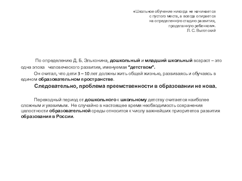 По определению Д. Б. Эльконина, дошкольный и младший школьный возраст – это одна эпоха человеческого развития, именуемая “детством”.