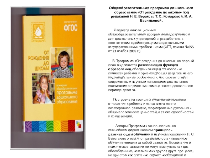 Является инновационным общеобразовательным программным документом для дошкольных учреждений и разработана в соответствии с действующими федеральными государственными требованиями (ФГТ, приказ №655 от 23 ноября 2009 г.).