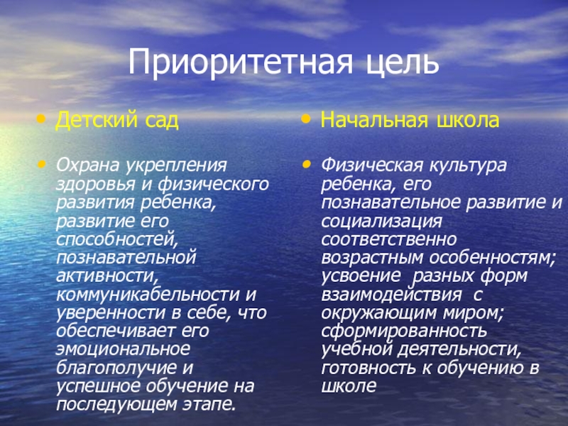 Физическая культура ребенка, его познавательное развитие и социализация соответственно возрастным особенностям; усвоение разных форм взаимодействия с окружающим миром; сформированность учебной деятельности, готовность к обучению в школе