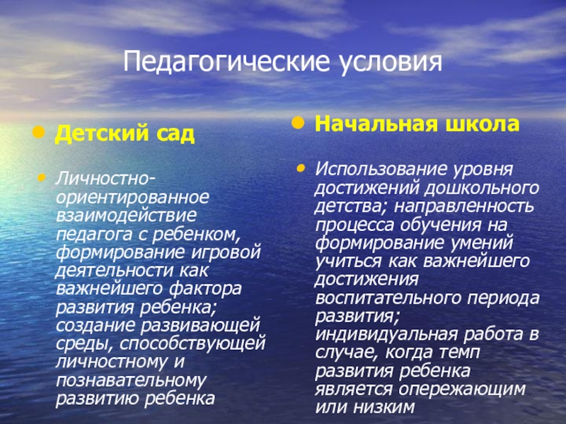 Использование уровня достижений дошкольного детства; направленность процесса обучения на формирование умений учиться как важнейшего достижения воспитательного периода развития; индивидуальная работа в случае, когда темп развития ребенка является опережающим или низким