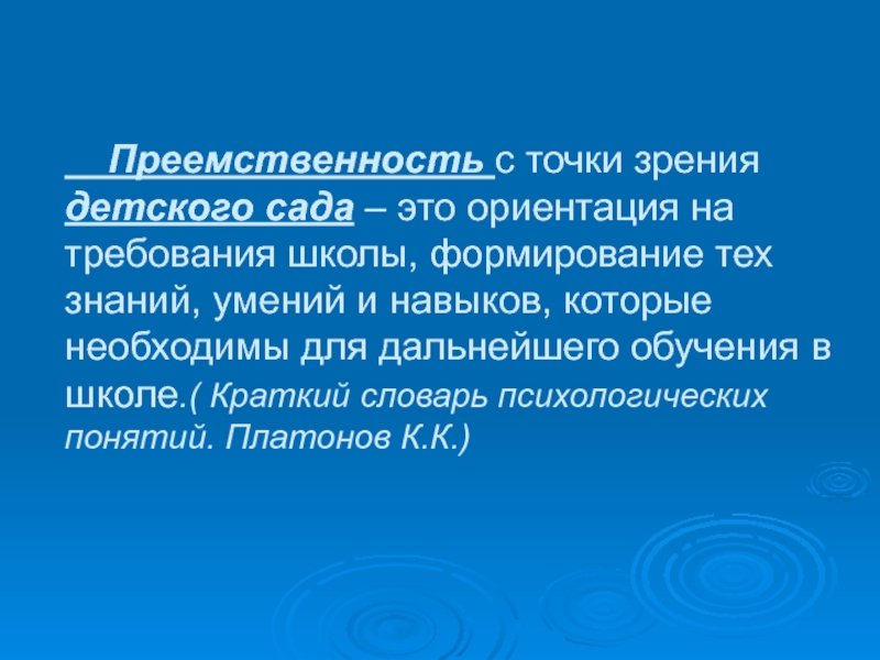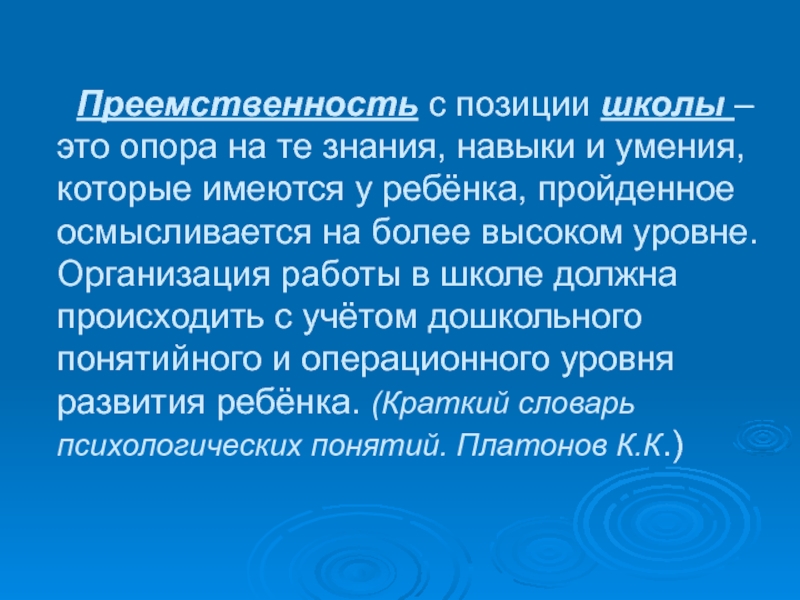 навыки и умения, которые имеются у ребёнка, пройденное осмысливается на более высоком уровне. Организация работы в школе должна происходить с учётом дошкольного понятийного и операционного уровня развития ребёнка. (Краткий словарь психологических понятий. Платонов К.К.)