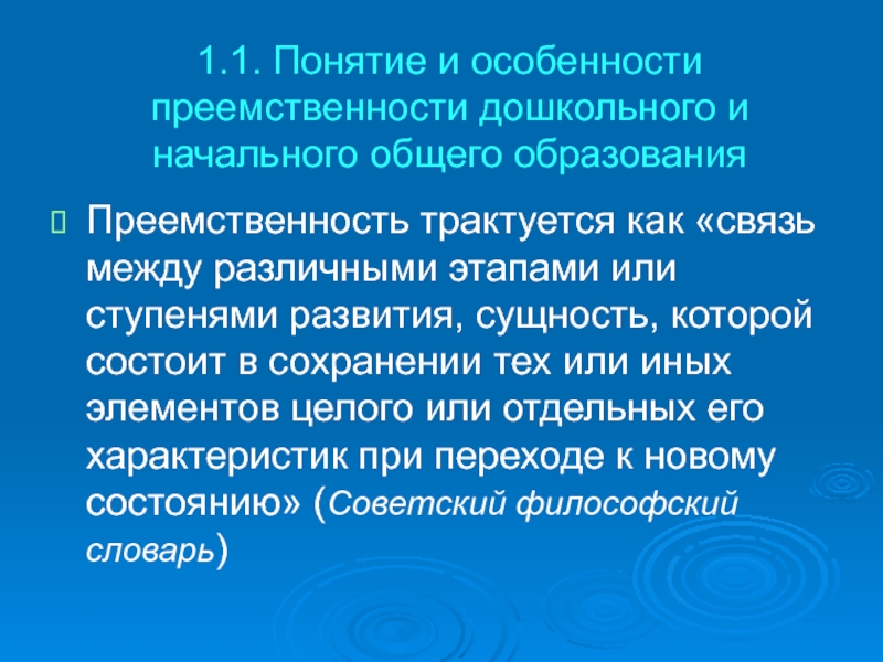 Слайд 101.1. Понятие и особенности преемственности дошкольного и начального общего образования