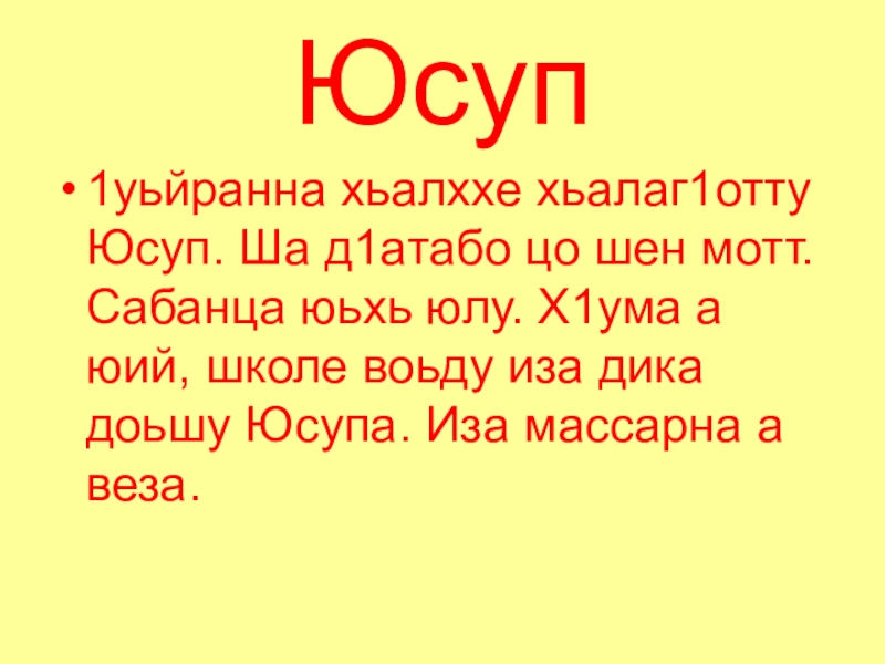 Юсуп1уьйранна хьалххе хьалаг1отту Юсуп. Ша д1атабо цо шен мотт.Сабанца юьхь юлу. Х1ума а юий, школе воьду иза