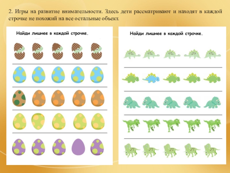 2. Игры на развитие внимательности. Здесь дети рассматривают и находят в каждой строчке не похожий на все остальные объект.
