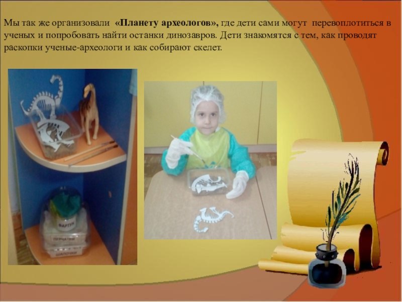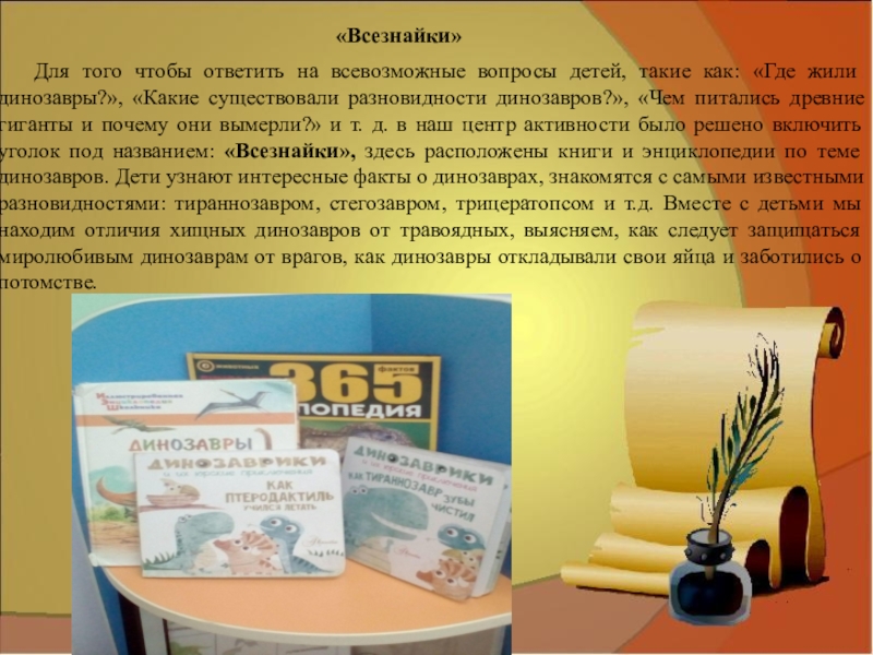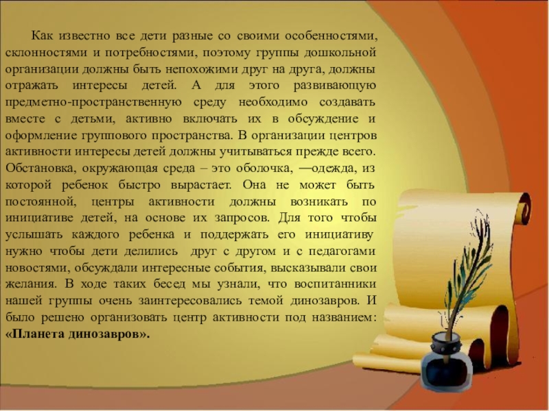 Как известно все дети разные со своими особенностями, склонностями и потребностями, поэтому группы дошкольной организации должны быть непохожими друг на друга, должны отражать интересы детей. А для этого развивающую предметно-пространственную среду необходимо создавать вместе с детьми, активно включать их в обсуждение и оформление группового пространства. В организации центров активности интересы детей должны учитываться прежде всего. Обстановка, окружающая среда – это оболочка, ―одежда, из которой ребенок быстро вырастает. Она не может быть постоянной, центры активности должны возникать по инициативе детей, на основе их запросов. Для того чтобы услышать каждого ребенка и поддержать его инициативу нужно чтобы дети делились друг с другом и с педагогами новостями, обсуждали интересные события, высказывали свои желания. В ходе таких бесед мы узнали, что воспитанники нашей группы очень заинтересовались темой динозавров. И было решено организовать центр активности под названием: «Планета динозавров».