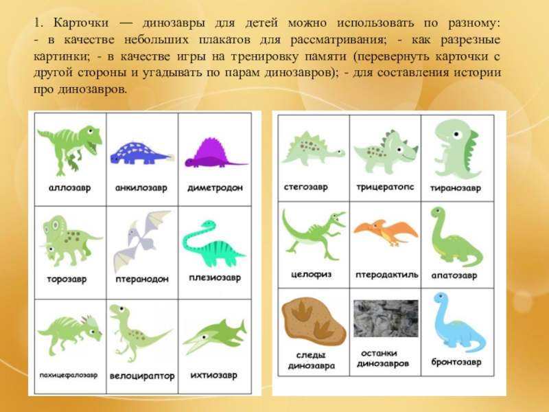 1. Карточки ― динозавры для детей можно использовать по разному: