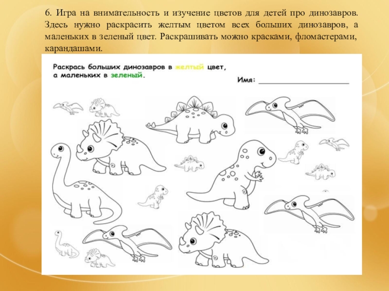 6. Игра на внимательность и изучение цветов для детей про динозавров. Здесь нужно раскрасить желтым цветом всех больших динозавров, а маленьких в зеленый цвет. Раскрашивать можно красками, фломастерами, карандашами.
