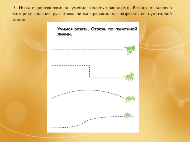5. Игры с динозаврами на умение владеть ножницами. Развивают мелкую моторику пальцев рук. Здесь детям предлагалось разрезать по пунктирной линии.