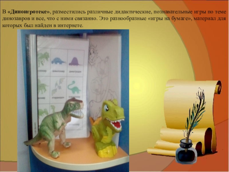 В «Диноигротеке», разместились различные дидактические, познавательные игры по теме динозавров и все, что с ними связанно. Это разнообразные «игры на бумаге», материал для которых был найден в интернете.