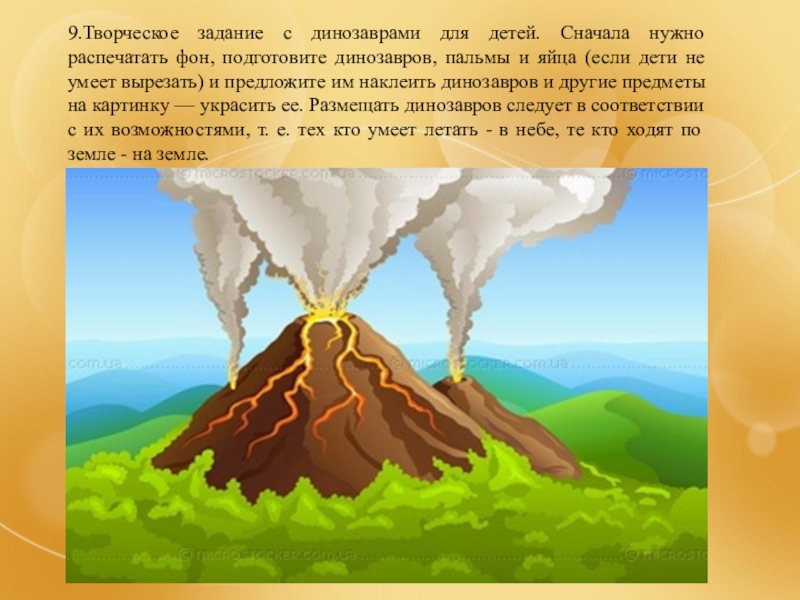 9.Творческое задание с динозаврами для детей. Сначала нужно распечатать фон, подготовите динозавров, пальмы и яйца (если дети не умеет вырезать) и предложите им наклеить динозавров и другие предметы на картинку — украсить ее. Размещать динозавров следует в соответствии с их возможностями, т. е. тех кто умеет летать - в небе, те кто ходят по земле - на земле.