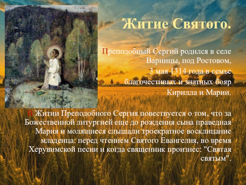 В Житии Преподобного Сергия повествуется о том, что за Божественной литургией еще до рождения сына праведная Мария и молящиеся слышали троекратное восклицание младенца: перед чтением Святого Евангелия, во время Херувимской песни и когда священник произнес: "Святая святым".