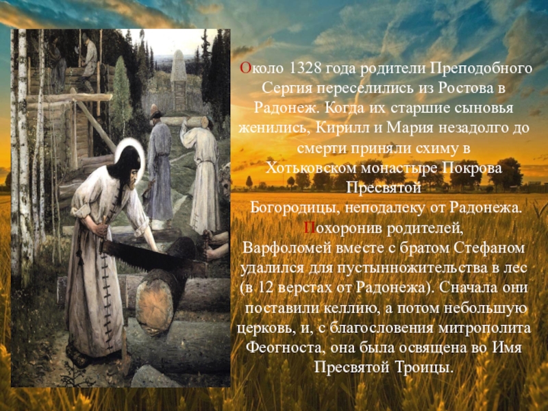 Около 1328 года родители Преподобного Сергия переселились из Ростова в Радонеж.