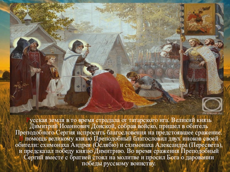 ига. Великий князь Димитрий Иоаннович Донской, собрав войско, пришел в обитель Преподобного Сергия испросить благословения на предстоявшее сражение. В помощь великому князю Преподобный благословил двух иноков своей обители: схимонаха Андрея (Ослябю) и схимонаха Александра (Пересвета), и предсказал победу князю Димитрию. Во время сражения Преподобный Сергий вместе с братией стоял на молитве и просил Бога о даровании победы русскому воинству.