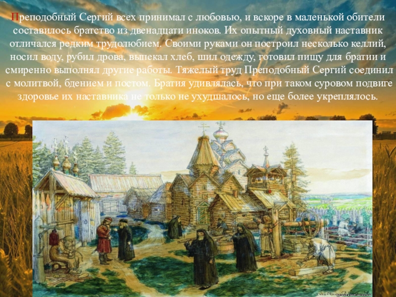 Слайд 9Преподобный Сергий всех принимал с любовью, и вскоре в маленькой обители