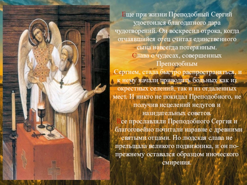 Еще при жизни Преподобный Сергий удостоился благодатного дара чудотворений. Он воскресил