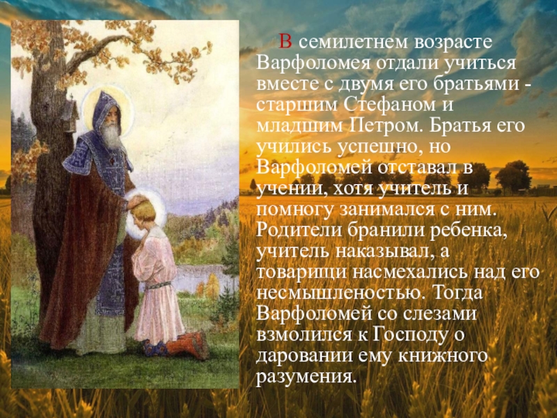 Слайд 6 В семилетнем возрасте Варфоломея отдали учиться вместе
