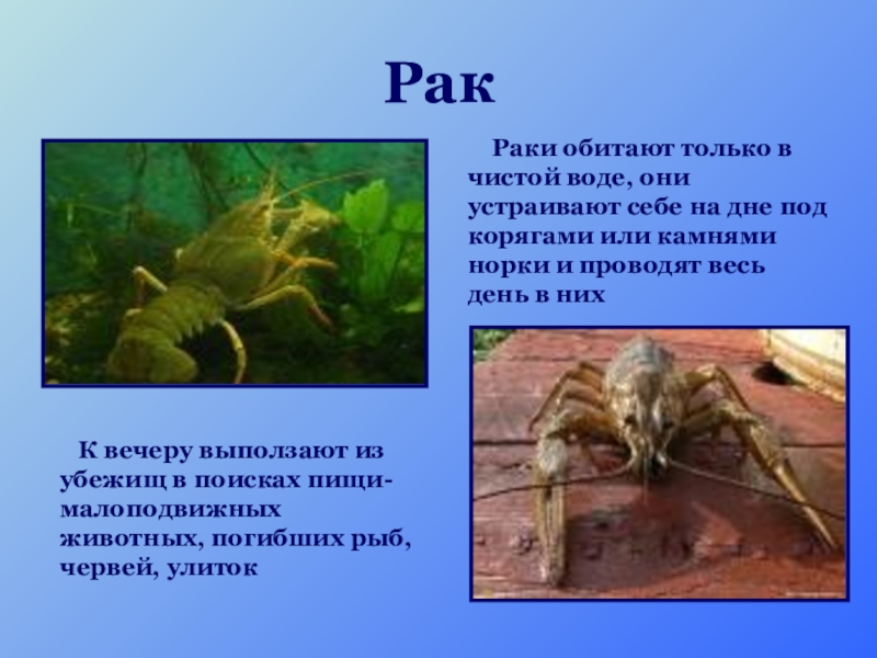 К вечеру выползают из убежищ в поисках пищи- малоподвижных животных, погибших рыб, червей, улиток