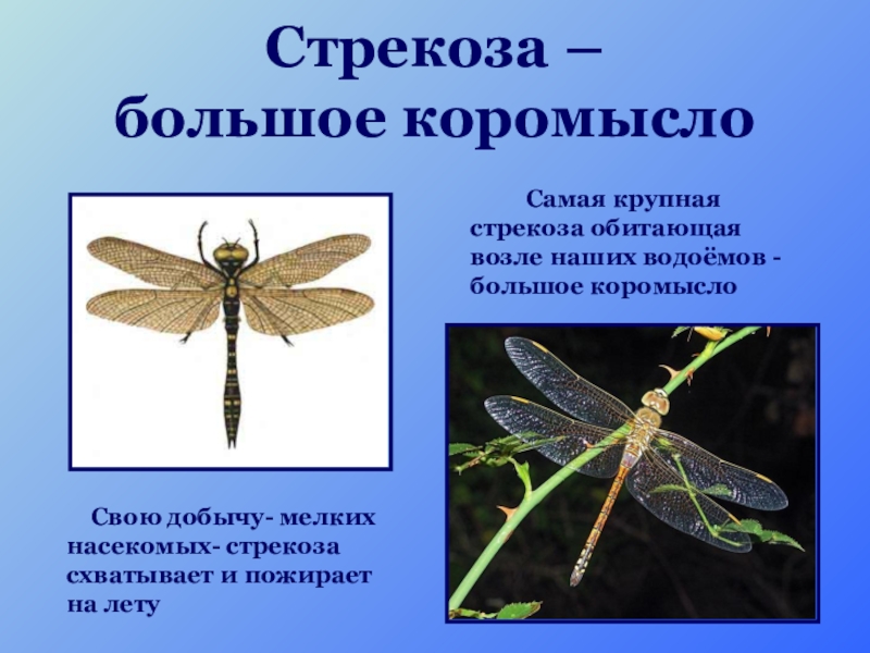 Свою добычу- мелких насекомых- стрекоза схватывает и пожирает на лету