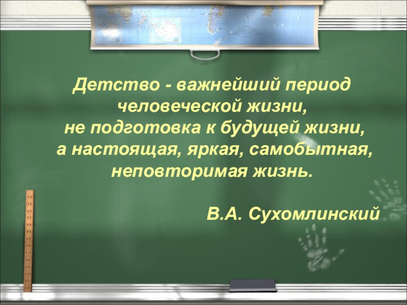Детство - важнейший период человеческой жизни, не подготовка к будущей жизни, а настоящая, яркая, самобытная, неповторимая жизнь.В.А.