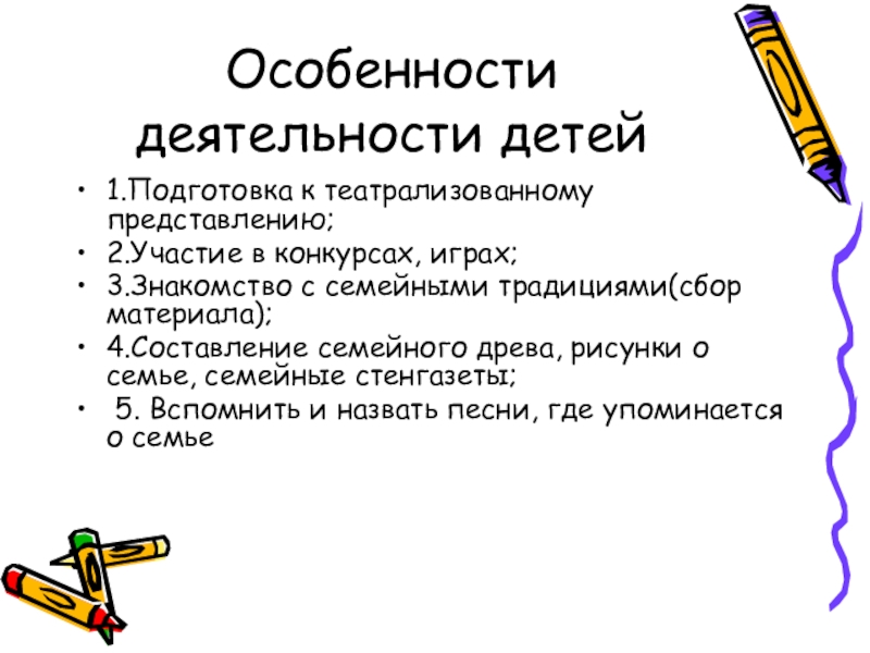 Особенности деятельности детей 1.Подготовка к театрализованному представлению;2.Участие в конкурсах, играх;3.Знакомство с семейными традициями(сбор материала);4.Составление семейного древа, рисунки