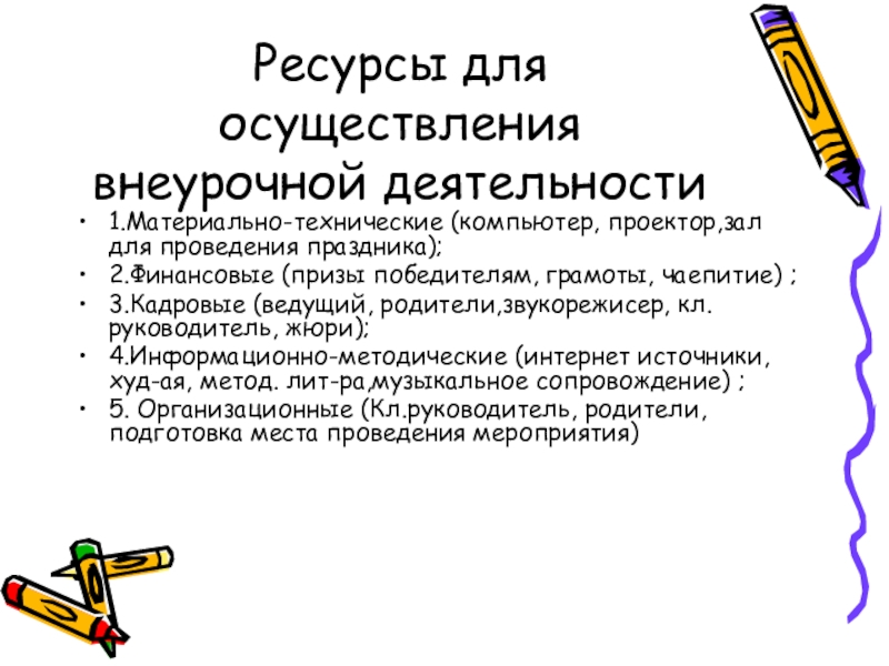 Ресурсы для осуществления внеурочной деятельности 1.Материально-технические (компьютер, проектор,зал для проведения праздника);2.Финансовые (призы победителям, грамоты, чаепитие) ;3.Кадровые (ведущий,
