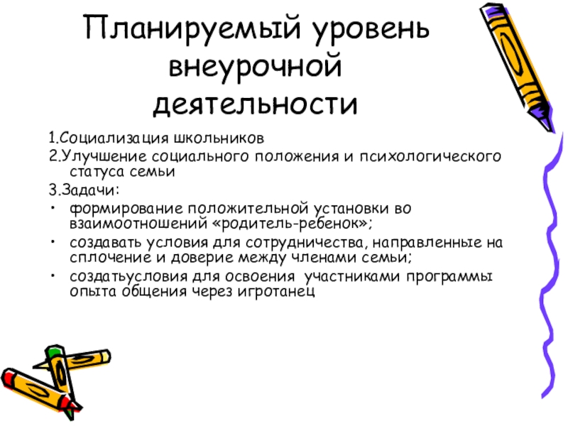 Планируемый уровень внеурочной  деятельности 1.Социализация школьников2.Улучшение социального положения и психологического статуса семьи 3.Задачи: формирование положительной установки