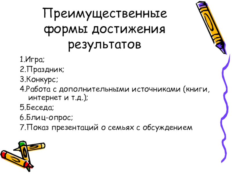Преимущественные формы достижения результатов 1.Игра;2.Праздник;3.Конкурс;4.Работа с дополнительными источниками (книги, интернет и т.д.);5.Беседа;6.Блиц-опрос;7.Показ презентаций о семьях с обсуждением