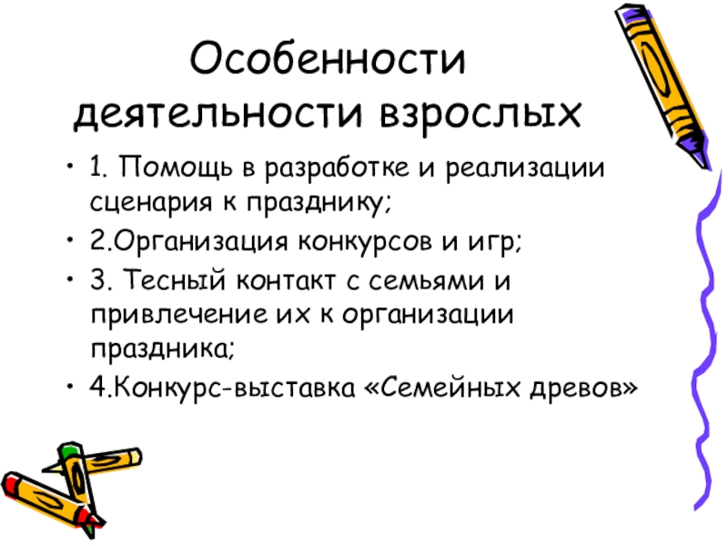 Особенности деятельности взрослых 1. Помощь в разработке и реализации сценария к празднику;2.Организация конкурсов и игр;3. Тесный контакт