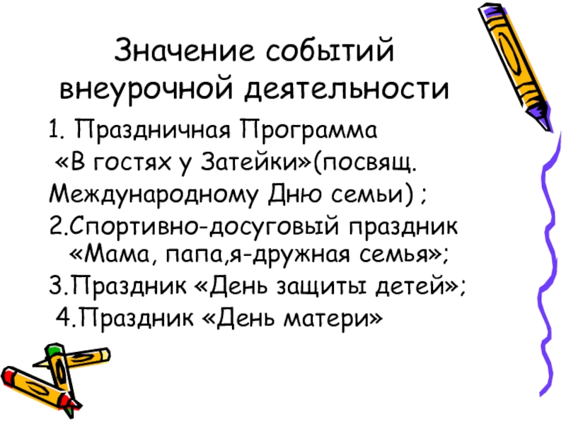 Значение событий внеурочной деятельности 1. Праздничная Программа «В гостях у Затейки»(посвящ.Международному Дню семьи) ;2.Спортивно-досуговый праздник «Мама, папа,я-дружная