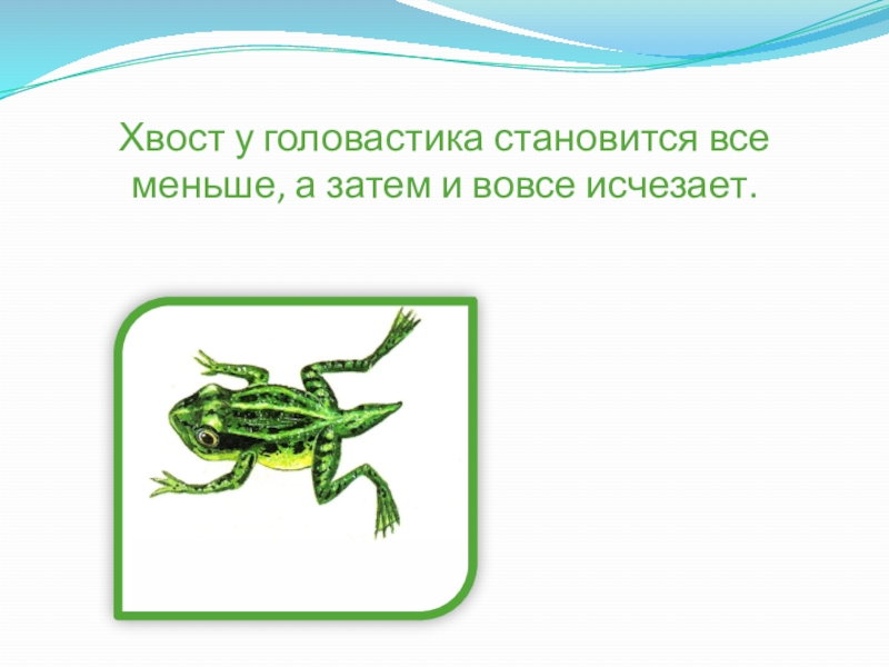 Слайд 9Хвост у головастика становится все меньше, а затем и вовсе исчезает.