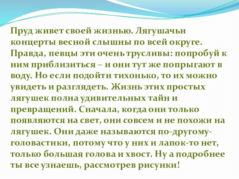 Правда, певцы эти очень трусливы: попробуй к ним приблизиться – и они тут же попрыгают в воду. Но если подойти тихонько, то их можно увидеть и разглядеть. Жизнь этих простых лягушек полна удивительных тайн и превращений. Сначала, когда они только появляются на свет, они совсем и не похожи на лягушек. Они даже называются по-другому- головастики, потому что у них и лапок-то нет, только большая голова и хвост. Ну а подробнее ты все узнаешь, рассмотрев рисунки!
