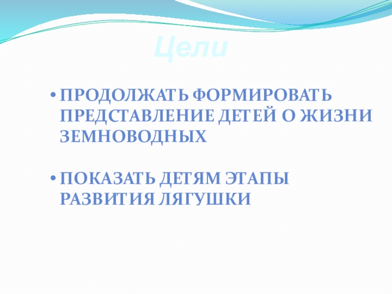 ЦелиПродолжать формировать представление детей о жизни земноводныхПоказать детям этапы развития лягушки