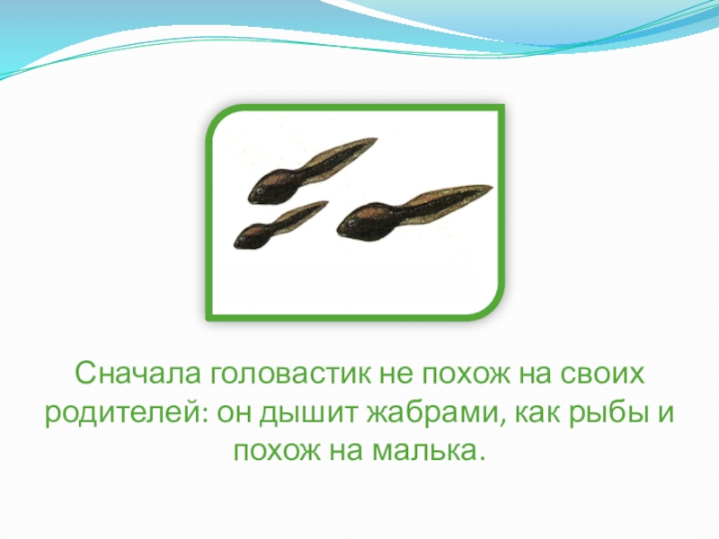 Слайд 6Сначала головастик не похож на своих родителей: он дышит жабрами, как