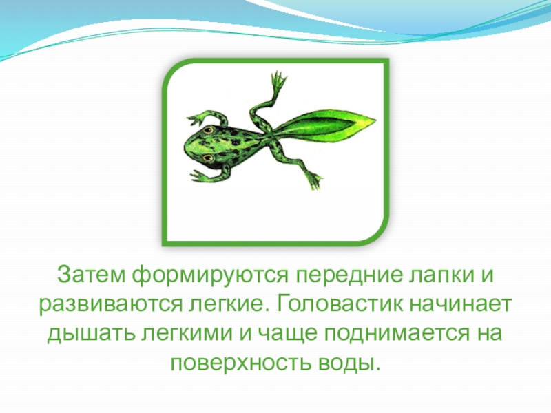 Слайд 8Затем формируются передние лапки и развиваются легкие. Головастик начинает дышать легкими